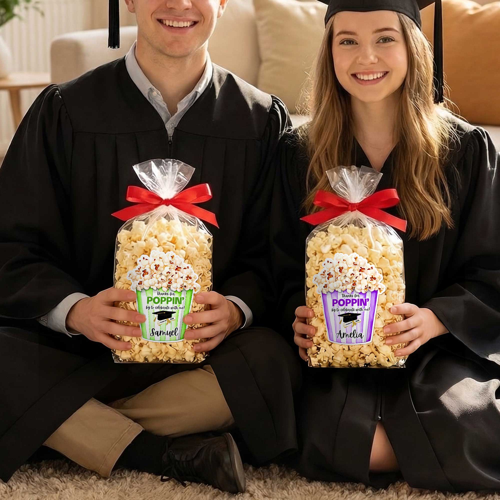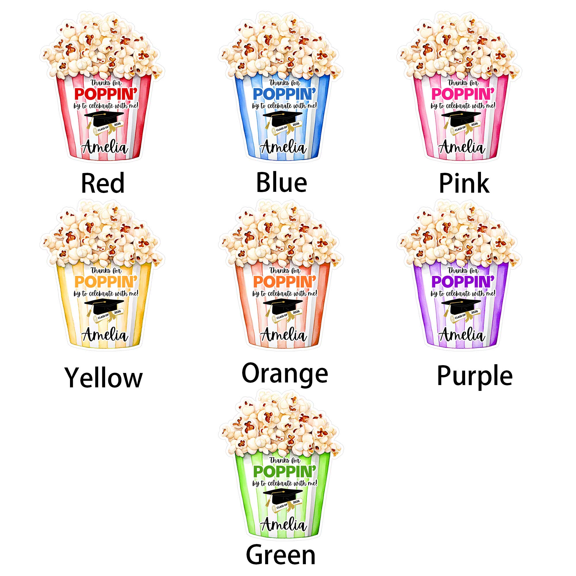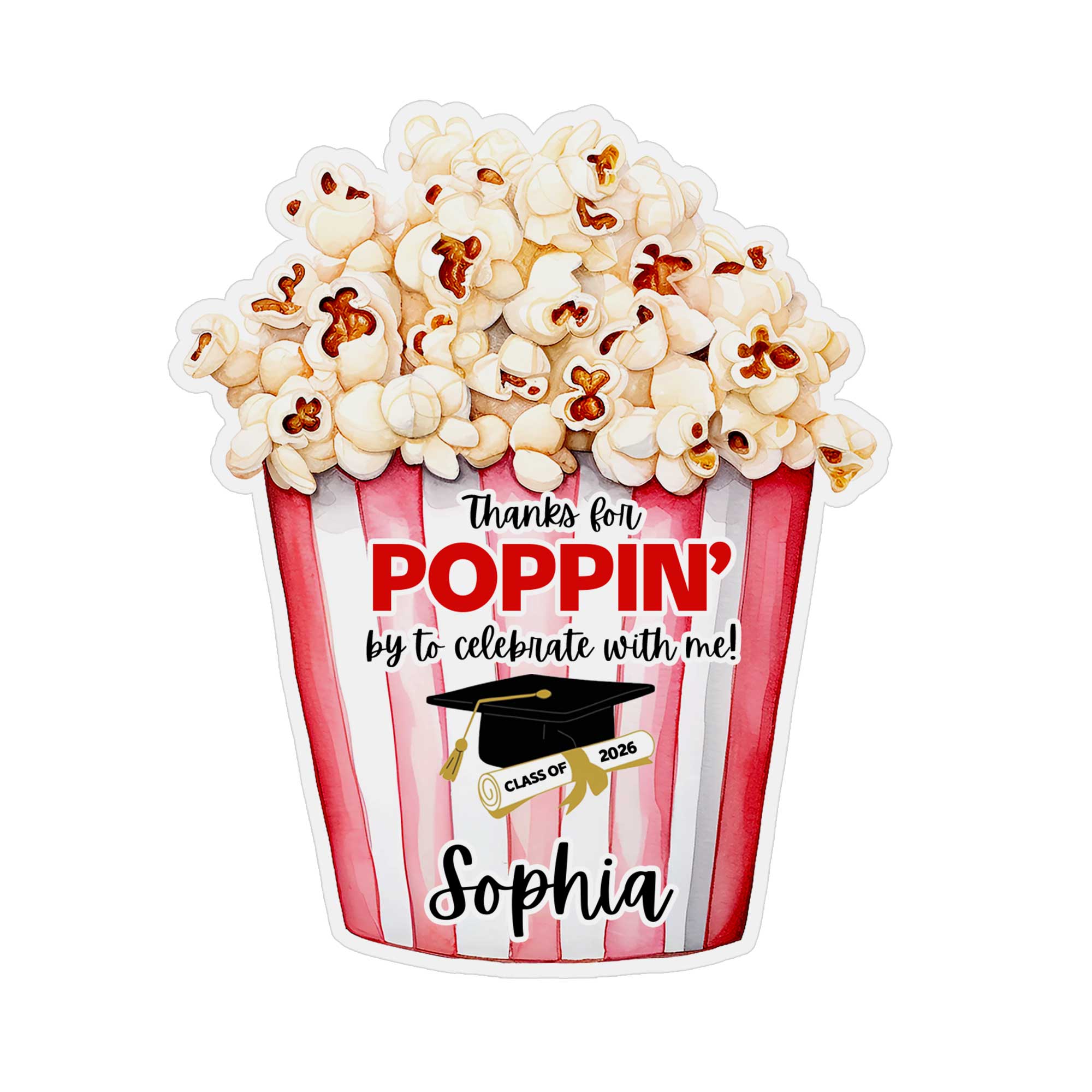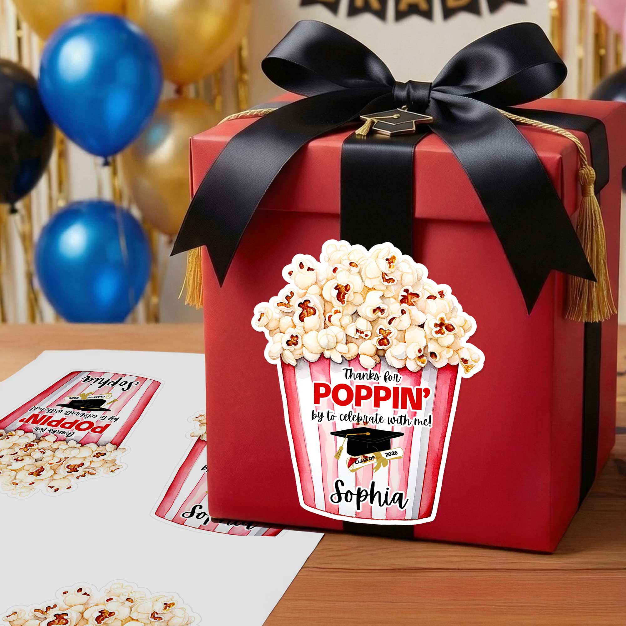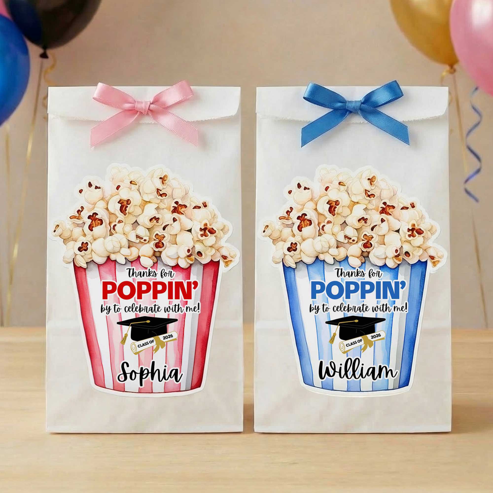 Custom Name & Year Thanks for Popping by to Celebrate Graduation Stickers, Gift Tags, Treat Bag Labels, Graduation Party Favors, Gifts for Graduates